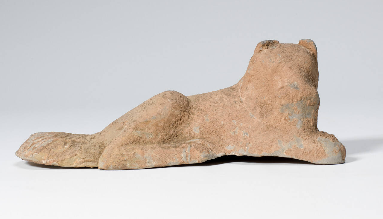 DescriptionGray ceramic figure of a reclining dog with its head turned over its right paw, with a bushy tail spread out behind it.Provenance