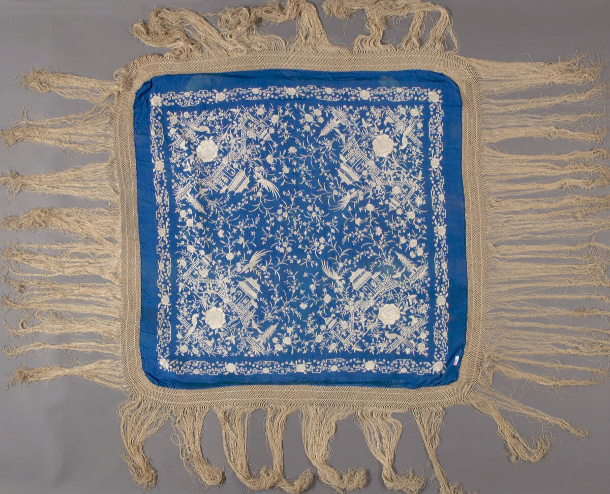 DescriptionBright blue silk satin ground, embroidered in each corner with large-scale designs of Lowestoft-style pavilions and with butterflies, phoenix, and a variety of floral motifs in white silk twist; the whole surrounded by a key-fret and flower border in the same embroidery and provided with long silk fringe.