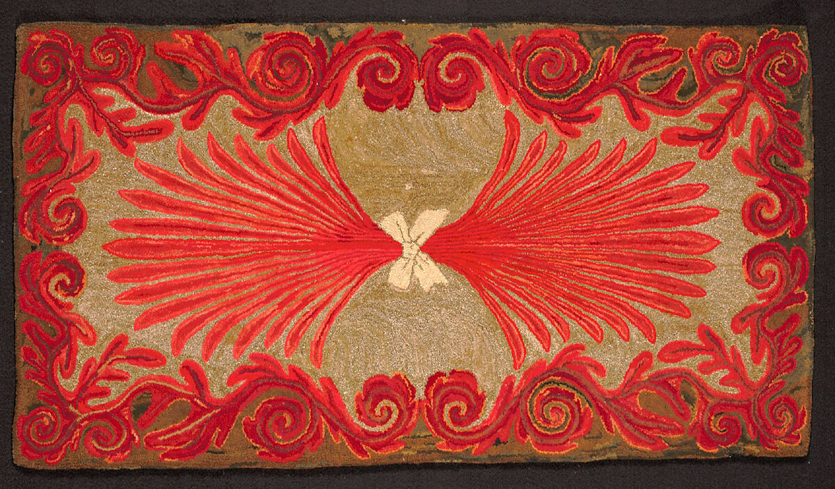 DescriptionBrown border enclosing tan inner background. Design around edge of red leaf and reverse scroll pattern. Double palmette of red, tied in center with bow.
