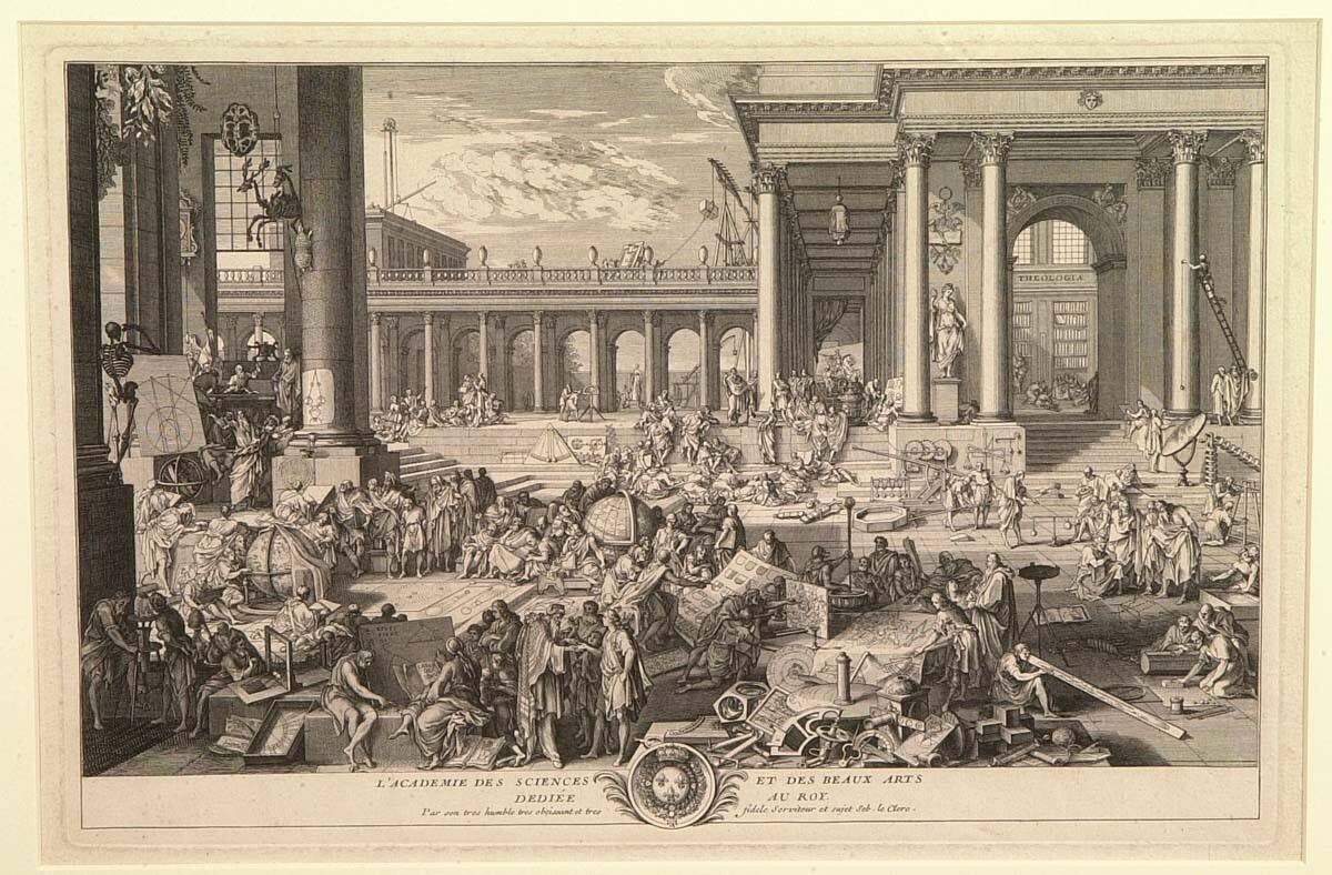 DescriptionThe engraving illustrates the Academy of Louis XIV, in which various subjects were taught, including architecture, mathematics, geography, medicine and painting, among others. Multiple figures dressed in loosely draped clothing are clustered around numerous scientific and mathematical instruments. The figures and equipment are scattered on varying levels in an open courtyard area surrounded by classical architecture characterized by arched entrances and Corinthian columns. On the right is a facade and arched entrance to a library with the word "Theologia" appearing near the top of the archway. The figures occupy the foreground, middleground and background; in the center a cluster of them surround a large illustration of various coats-of-arms; on the left is one of two globes visible in the composition with an accompanying group of figures.