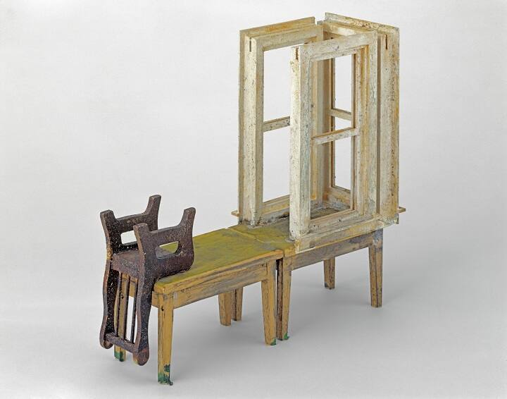 DescriptionTwo wood straight-legged doll house tables painted loosely in mustard colored wash, placed end-to-end. One table supports three white wood window frames which create a niche at its far end. Opposite the windows, inverted with seat resting upon the far end of the second table, is a brown chair. The tips of the table legs are colored with green marker.Copyright© Estate of Siah Armajani / Artists Rights Society (ARS), New York