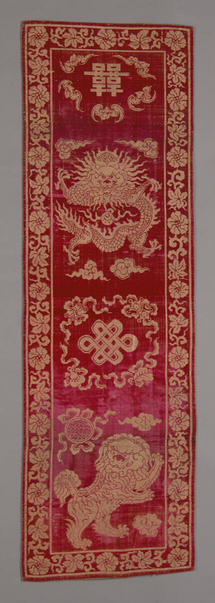 DescriptionDark red velvet with a large dragon near the center and a lion at the bottom, with a floral border, all in gold.