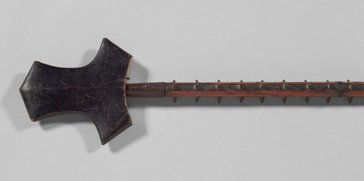 DescriptionThe pole is made of oak, red lacquer, and iron. The blade is tempered steel. The iron cap is missing.