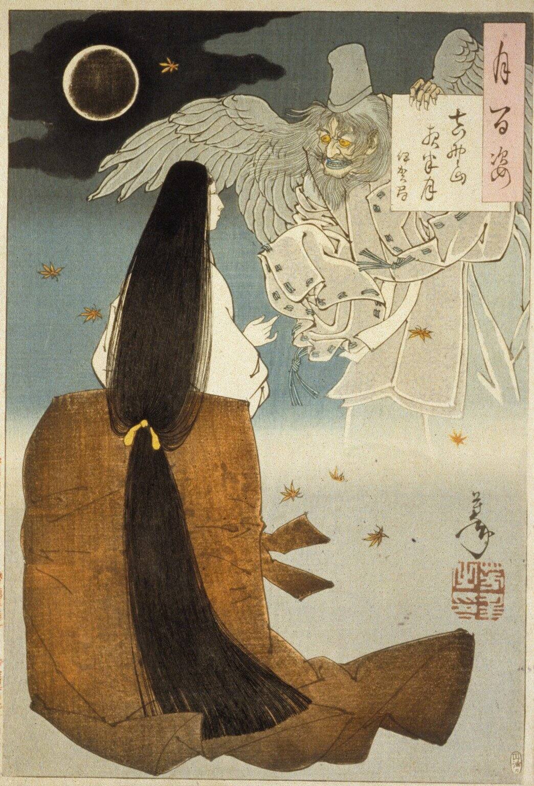 Yoshitoshi was known for his theatrical depictions of legends and folklore. This print comes from the series 100 Aspects of the Moon. The prints from this series illustrate scenes of famous women dressed in ancient courtly attire and bathed in the moonlight.