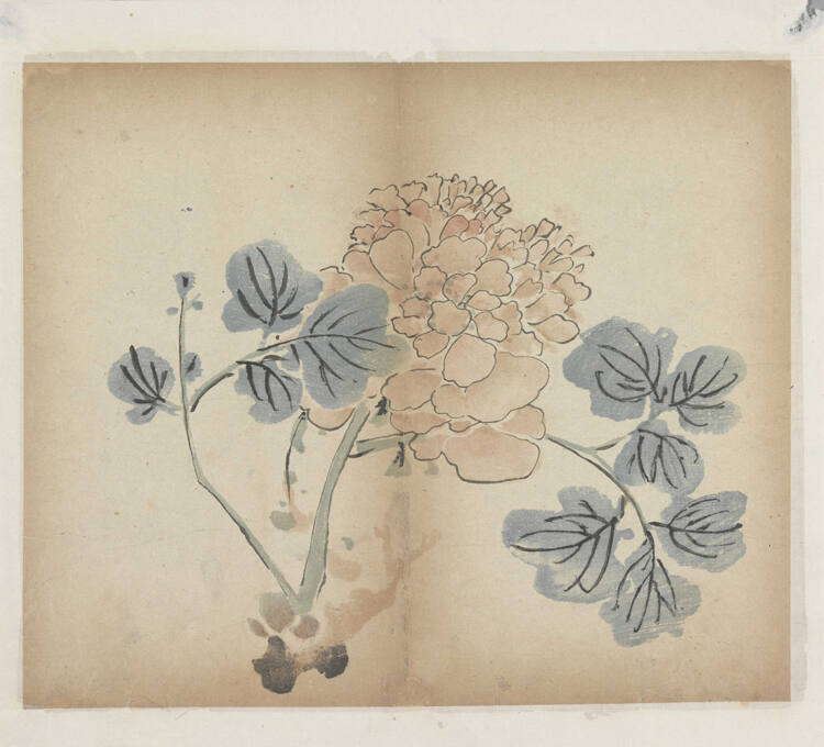 DescriptionPrint of a large peony and several leaves, in brown, blue and gray.