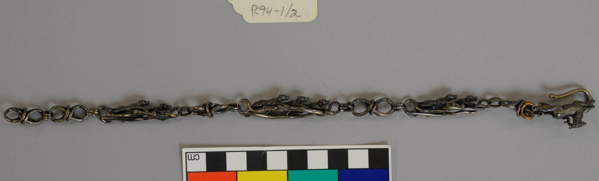 DescriptionChain with figure of stag at one end with hook clasp; twisted wire links in form of twigs with three running dogs in center with two pairs of dogs between center and each end.