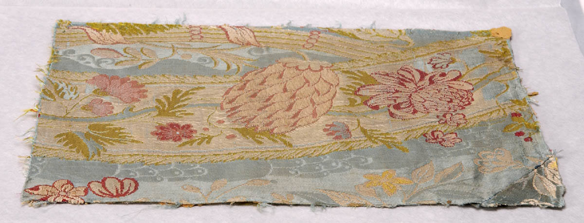 DescriptionMotif of chrysanthemums and stems in green, red, and yellow on a background of blue.