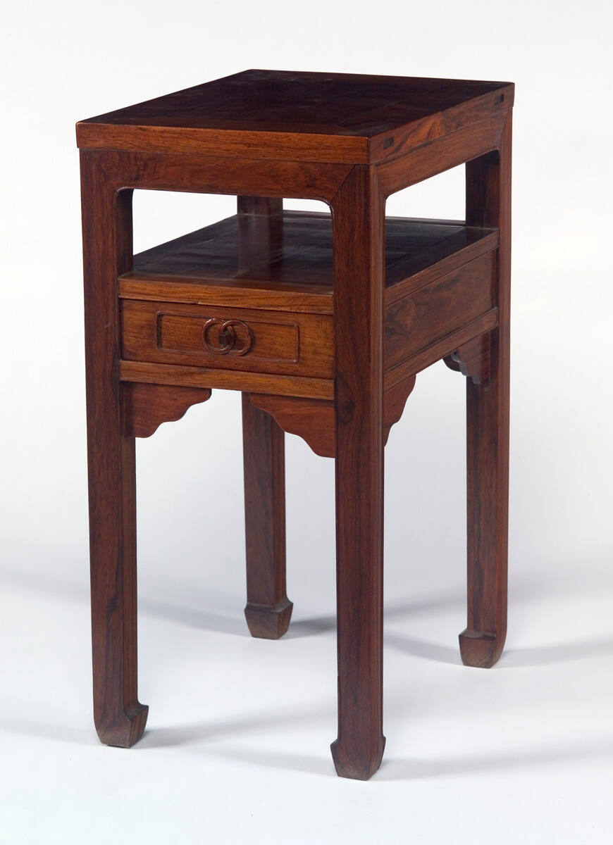 DescriptionOne of a pair of huanghuali table pedestals with flush floating panel from tops with a square outside edge and no waist. The plain apron is flush and butt-joined to the underside of the frame top, mitred and half-lapped (?) into the tops of the square legs which taper to the very vertical horse hoof foot. The apron, leg, and foot are cut with a partially raised bead. A drawer unit consisting of an eight-part frame tenoned into the inside edge of the legs with a flush floating panel to the top and slightly recessed panels to the sides and back is fitted with a drawer with a raised bead and turned handle. Beneath the lower rails are short-shaped solid spandrels.