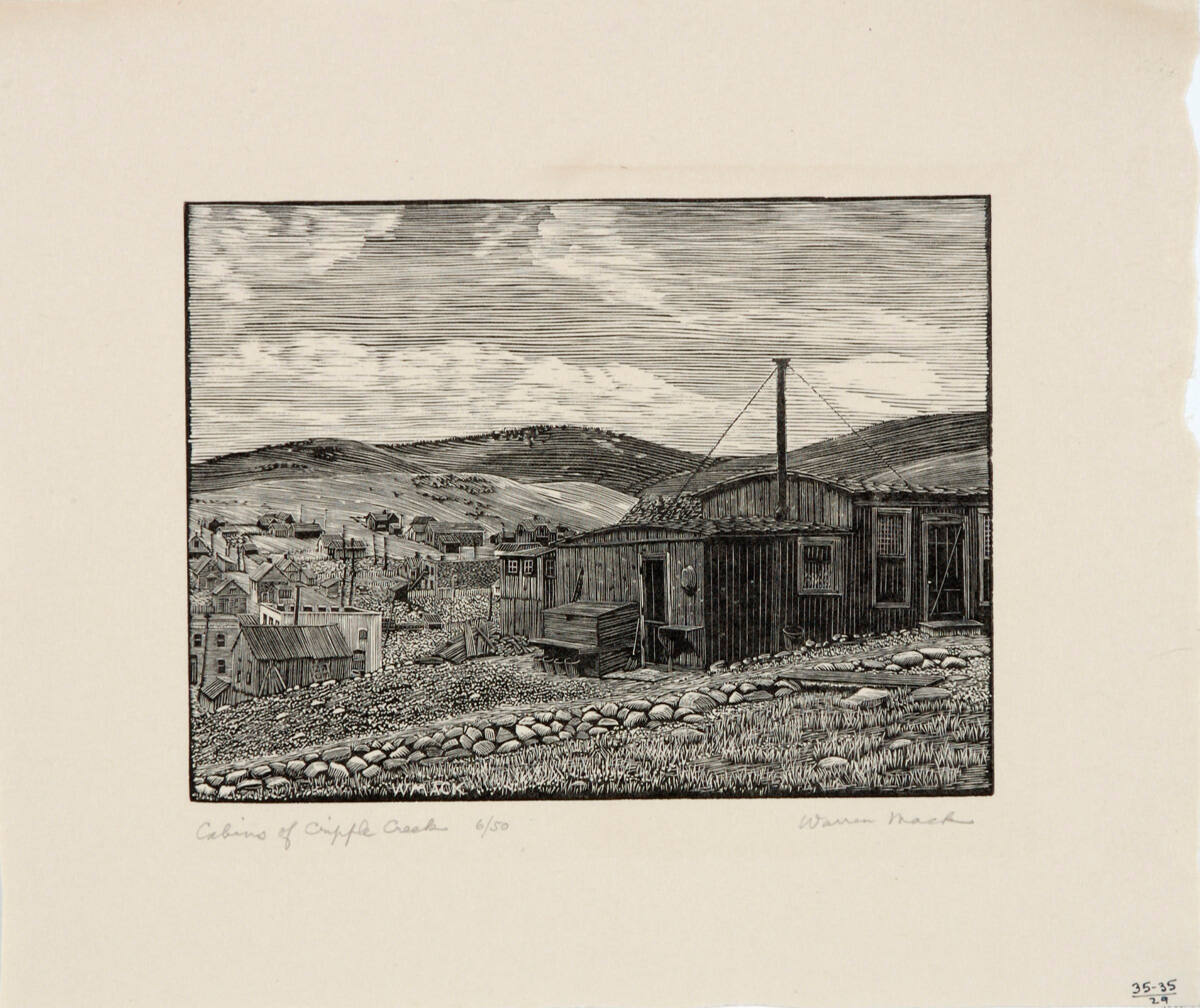 Gallery LabelWarren Bryan Mack, chair of the horticulture department at Penn State University, was renowned for his refined and highly detailed wood engravings. He dedicated much of his art to the subject of his research: plants. This exemplary composition, however, depicts the historic cabins that dot the rolling landscape around Cripple Creek, Colorado, a former mining camp near Pikes Peak that was put on the map by gold fever in 1890.