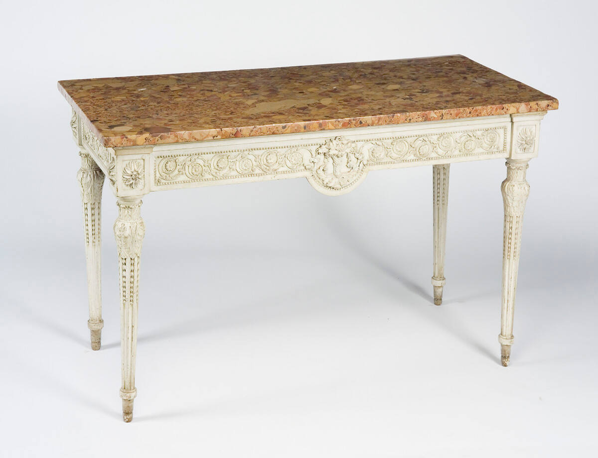 DescriptionRectangular-shapeed top with frieze carved with floral scrolls and beading. Fluted tapering legs, Breche d'alpe marble top.