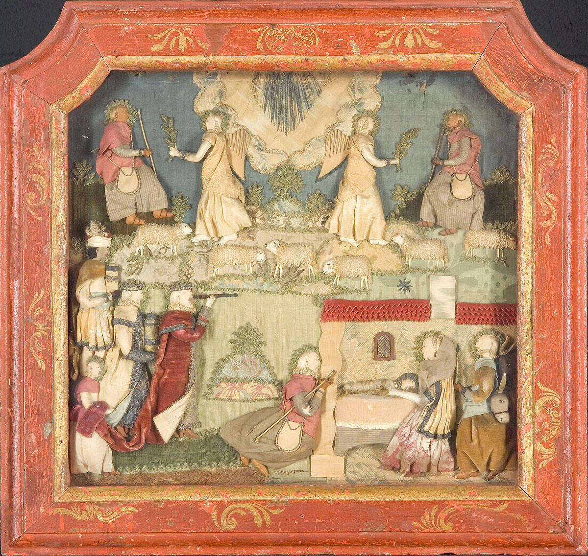 DescriptionCenter top, light rays from star, on either side of which an angel presents branch to a shepherd, sheep grazing at his feet. Lower left, Magi bearing gifts; lower right, within shelter, Mary and Joseph behind cradle, with heads of ass and ox at frame's edge. Shepherd kneeling before cradle.