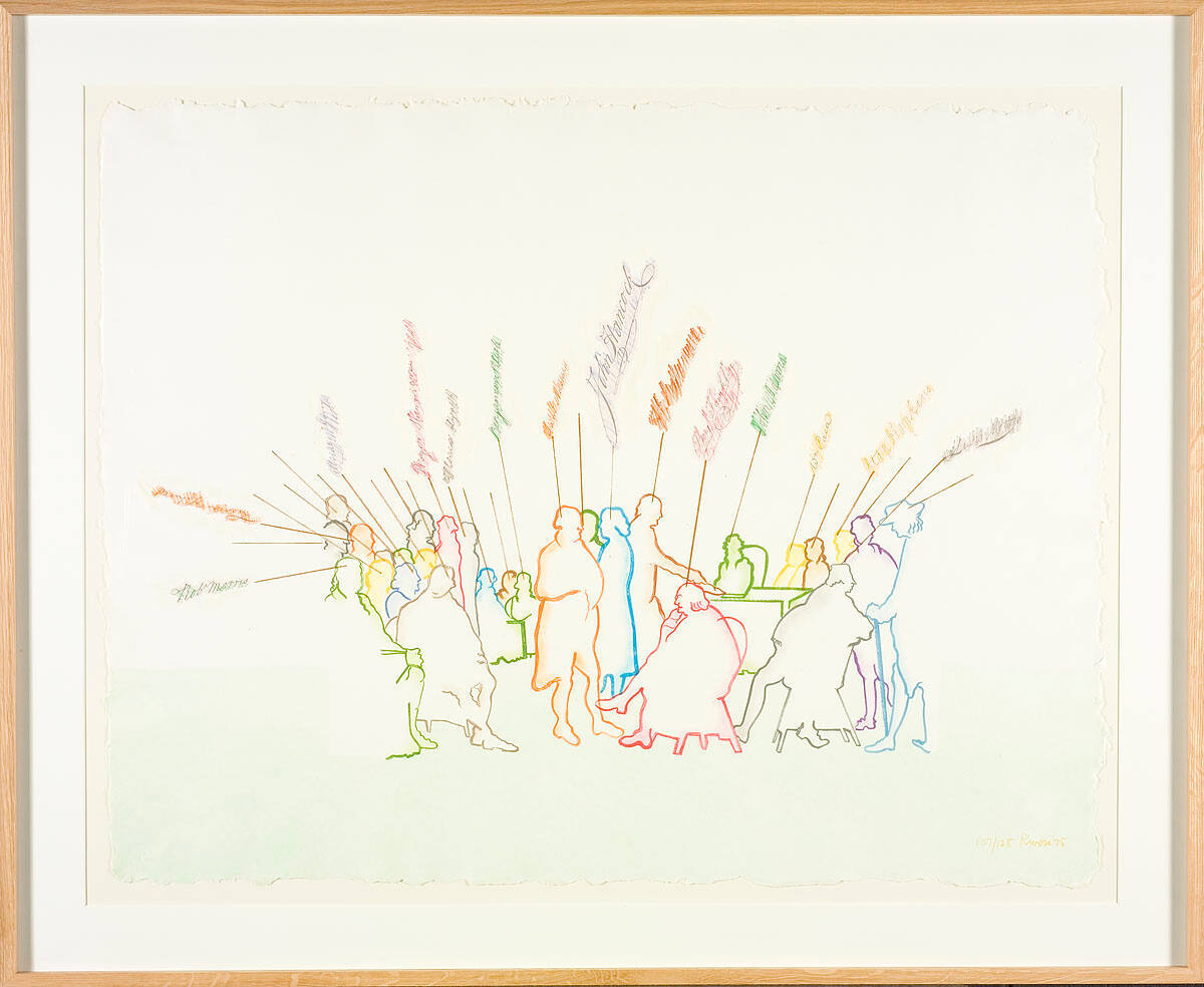 DescriptionOn pale green ground, standing and seated figures with colored contours, identified in part as signers of Declaration of Independence by script signatures in corresponding colors written above heads and connected thereto by straight lines.Copyright© Estate of Larry Rivers/Licensed by VAGA at Artists Rights Society (ARS), New York