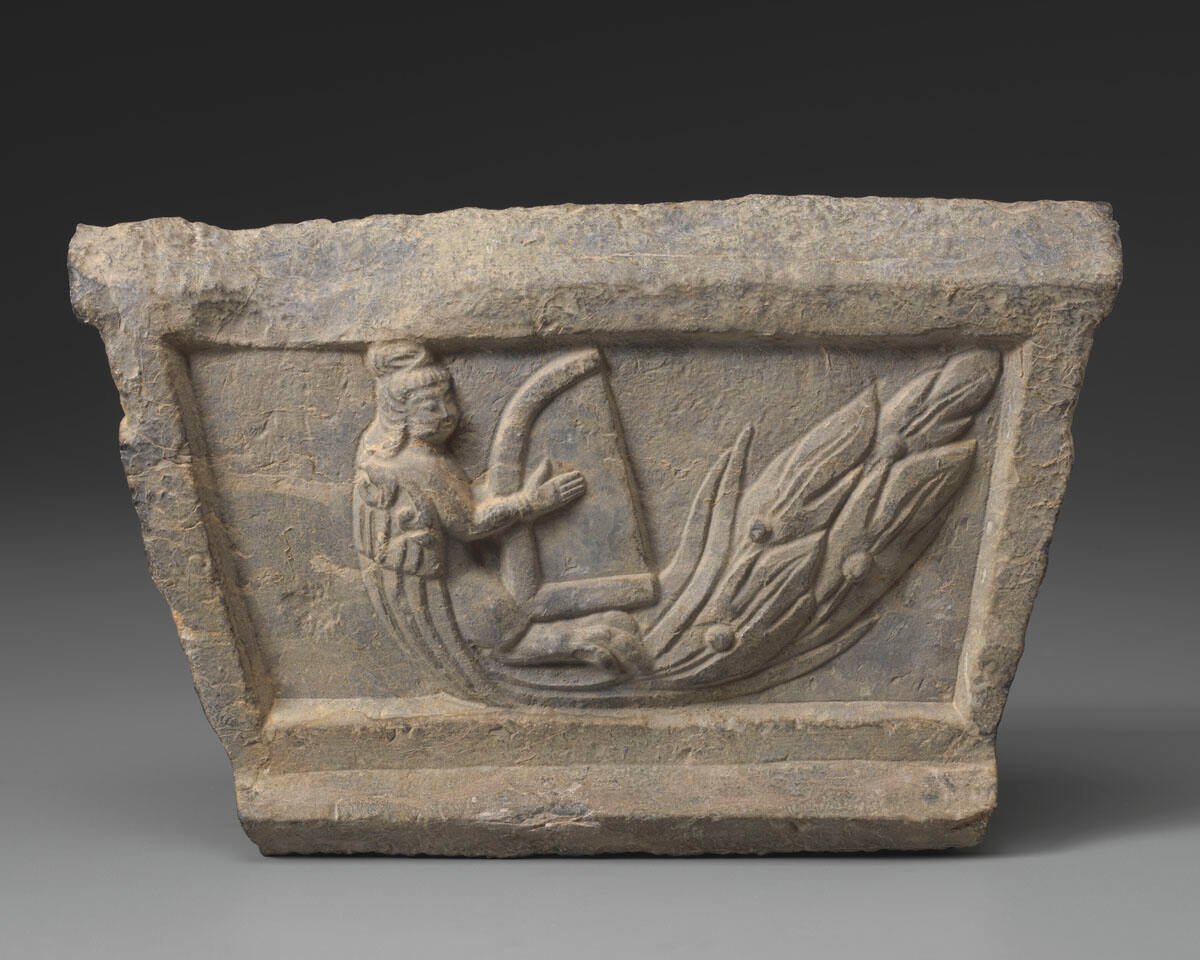 This small block depicting heavenly musicians (kalavinka) were part of eight reliefs that once decorated the pedestal or wall panel of a Buddhist altar. According to Buddhist literature, a kalavinka is a creature with an angelic human head, torso, and arms and bird wings, legs, and billowy tail. It sings in a beautiful voice, following the rhythm of the instrument it plays. The hybrid figure became popular in Chinese Buddhist art from 600 to 1000 C.E. In the early 1900s, collectors commissioned ink rubbings of the limestone fragments.