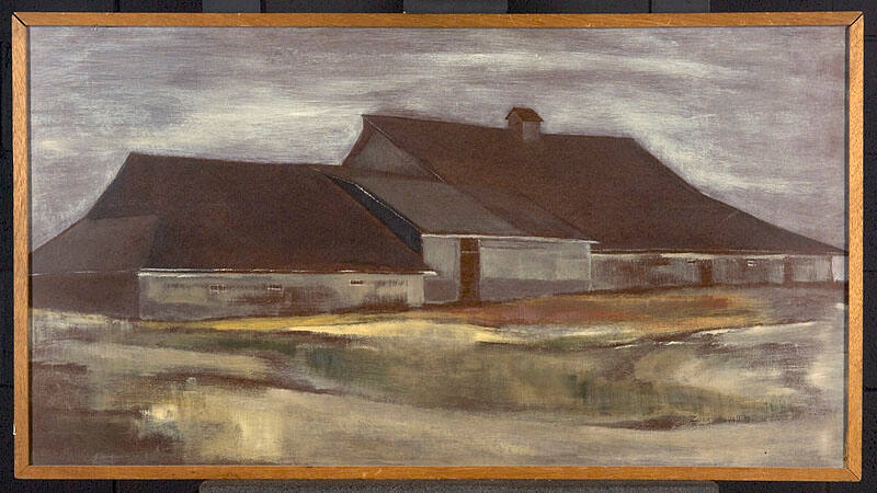 DescriptionView slightly from left of long, gray, black-roofed barn in three sections, hightest right topped by small cupola. Flat gray, yellow, and brown foreground.Copyright© Zora Duvall