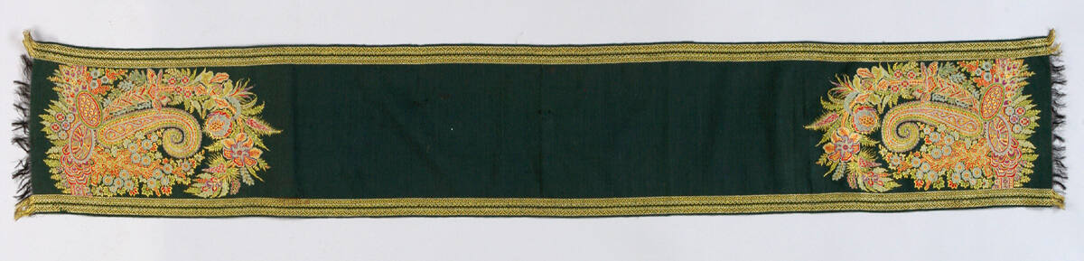 DescriptionDark green blue Paisley scarf with embroidered desgin of red, blue, yellow and green on each end. Yellow border along sides of scarf, fringed ends.