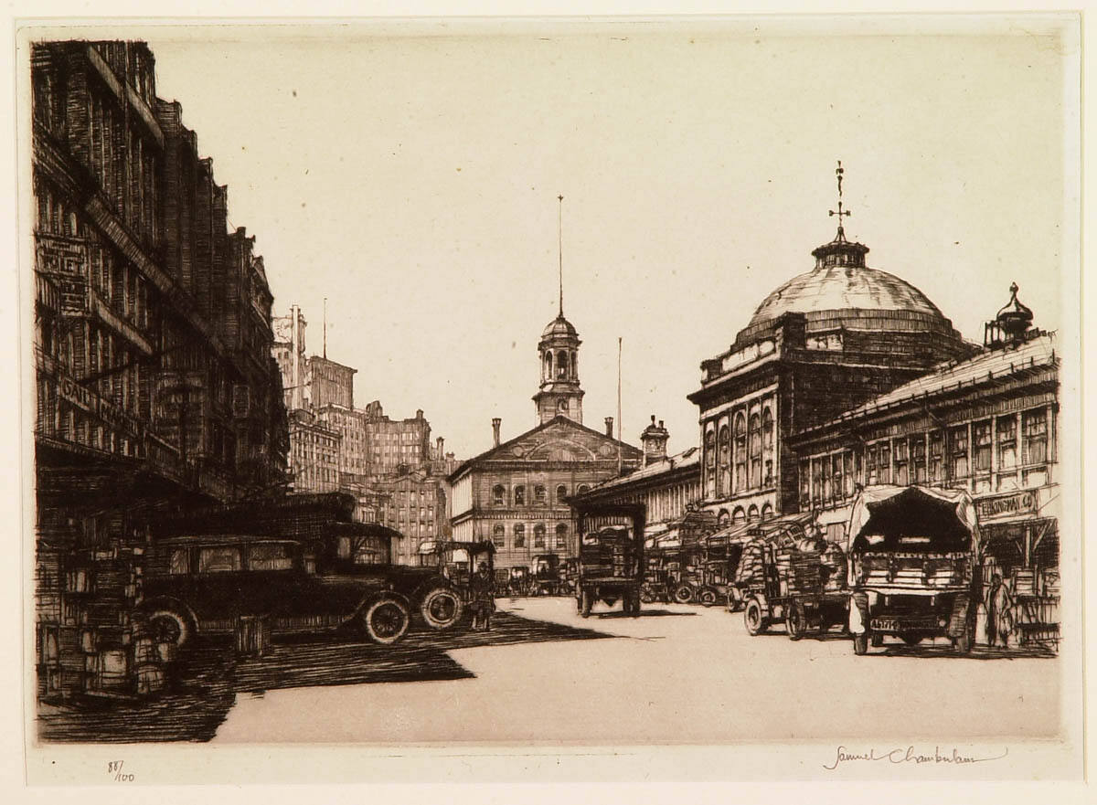 Gallery LabelSamuel Chamberlain was an architect and prolific printmaker. Faneuil Hall, Boston demonstrates his understanding of both disciplines. He combined depth, textures and the interplay of light and dark with details that make us feel as if we are there at this historic meeting hall and marketplace.